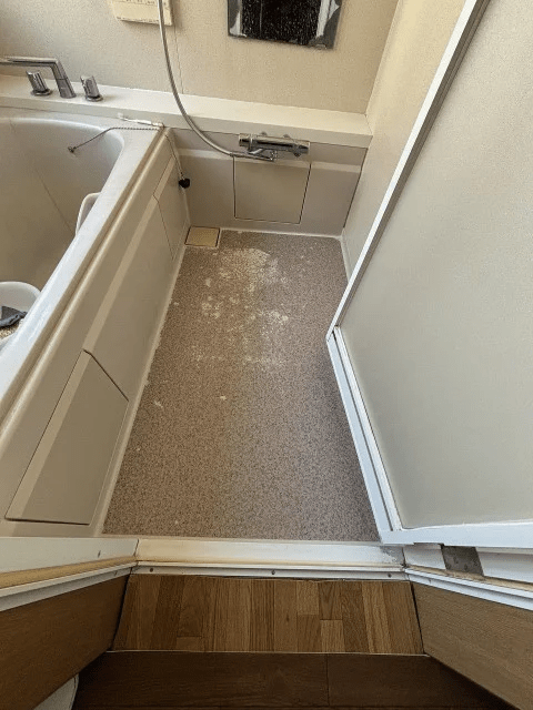 今回はユニットバスの床面が劣化し、表面が剥がれてきている状態でしたので、浴室専用の床シート施工をご提案させていただきました。